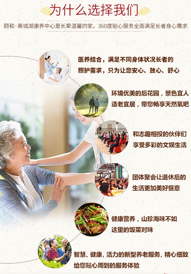 九江市颐和养老服务有限责任公司( 颐和·赛城湖康养中心),背靠庐山,毗邻八里湖,交通便利,设施一流。该项目与柴桑区红十字会医院、柴桑区康宁医院同属一集团,并以兄弟集团卓越医疗技术为依托,采用医养健结合的新型养老模式;项目引进一线城市的先进管理和运营理念,提供标杆式养老服务,打造九江五星养老品牌。